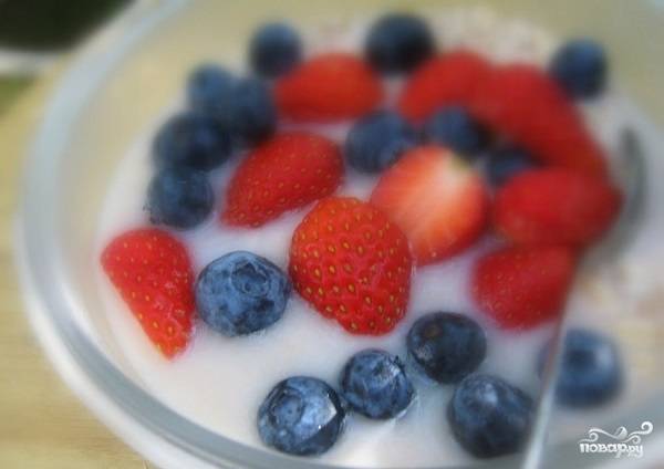 3. Если вы используете натуральный йогурт без добавок (или вы сладкоежка) можете добавить ложку меда, сахар или сгущенку. Аккуратно все перемешайте, стараясь не мять ягоды.