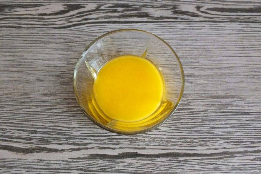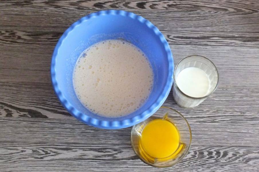 Во взбитую, яичную массу добавьте растопленный маргарин, молоко. Еще раз хорошо взбейте.