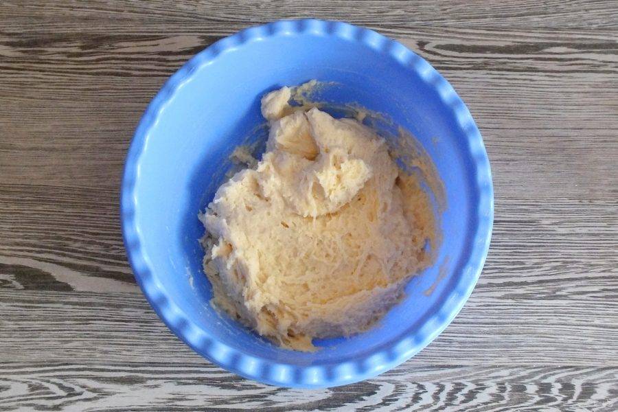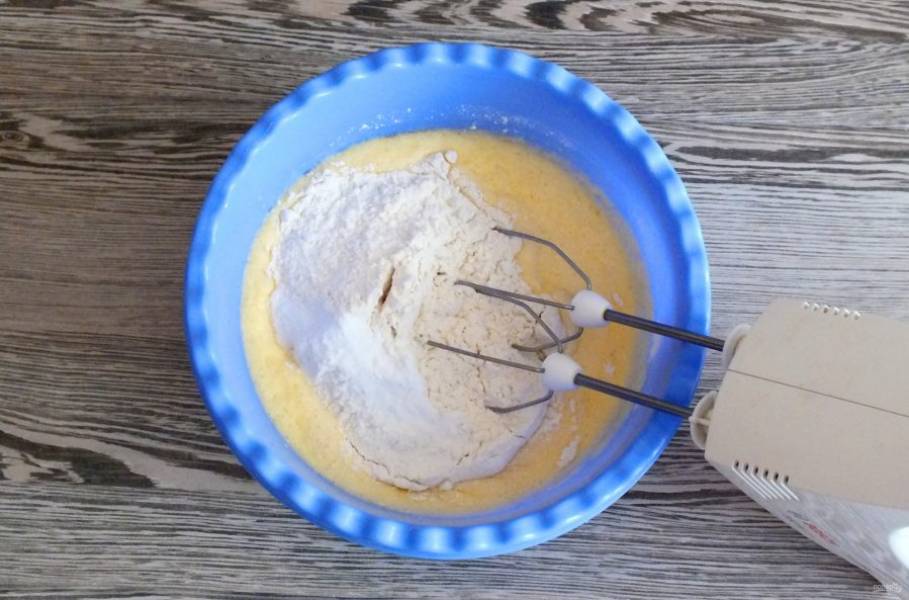 Добавьте муку, соду. На медленной скорости замесите миксером тесто.