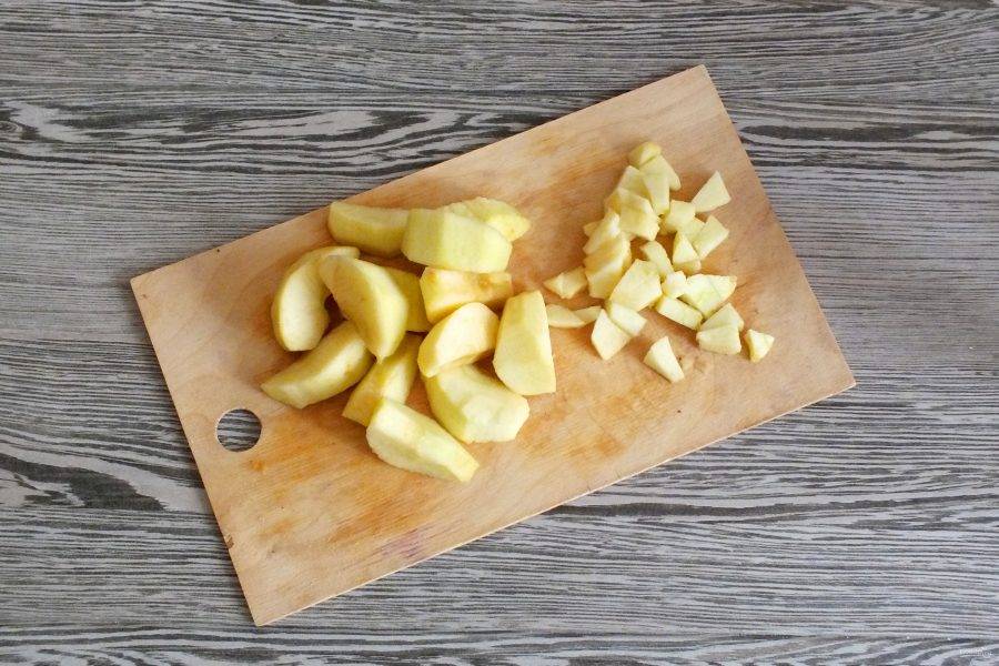 Яблоки очистите от семенной коробочки и кожуры. Нарежьте кубиками, ориентировочно размером около 1-1,5 см.
