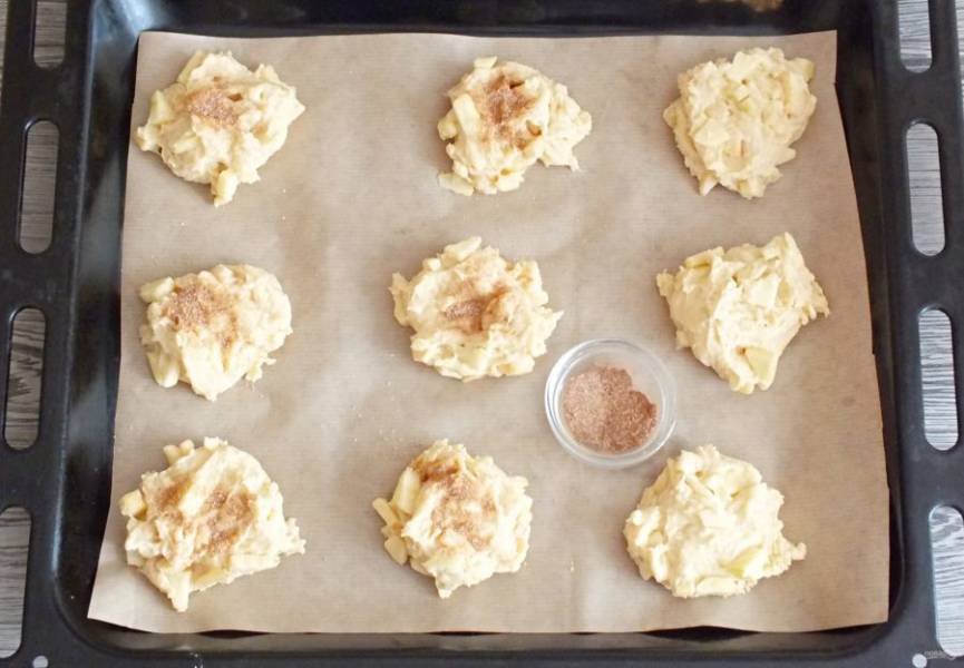 Застелите противень бумагой для выпечки. Разложите тесто ложкой, формуя округлую булочку. На одну булочку — одна столовая ложка с верхом теста. Смешайте желаемой количество корицы и сахара. Присыпьте верх булочек. Поставьте противень в разогретую до 180 градусов духовку на 20-25 минут. Учитывайте особенности своей духовки!