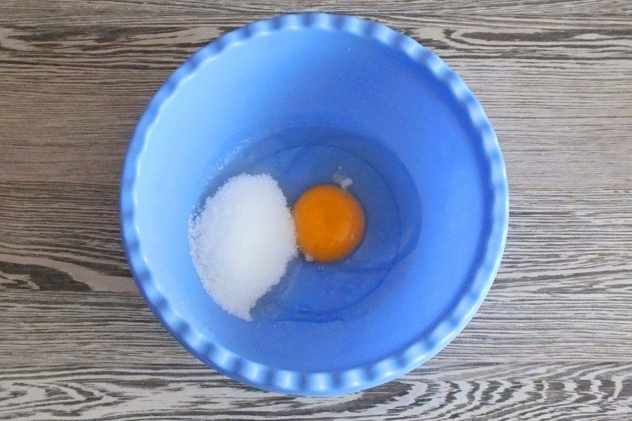 В чаше соедините яйцо и 50 грамм сахара. Взбейте миксером в пышную пену.