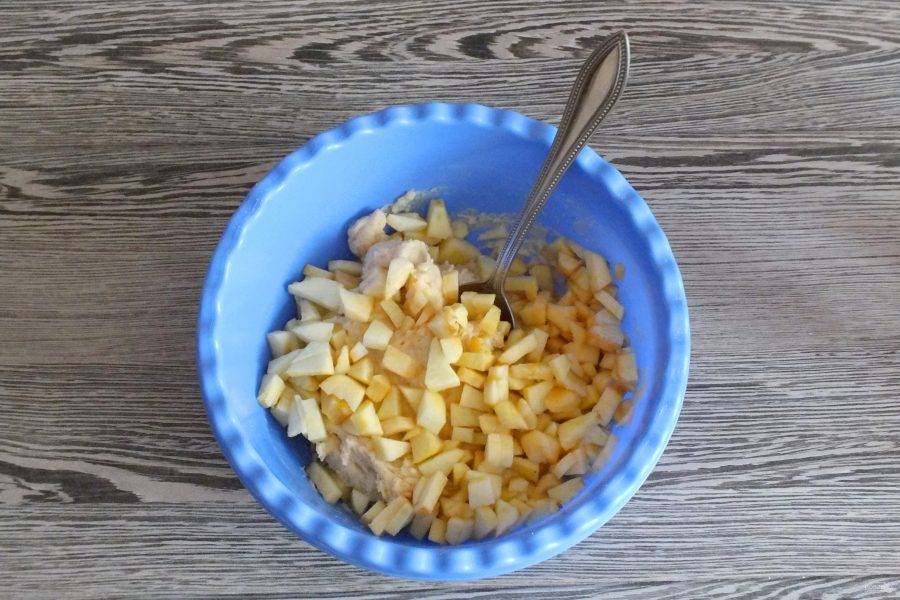 Нарезанные яблоки добавьте в тесто. С помощью ложки вмешайте яблоки.