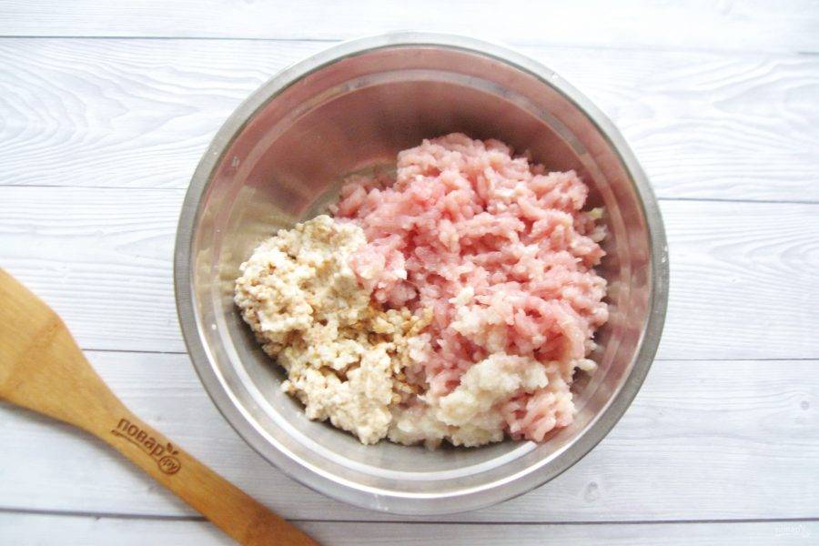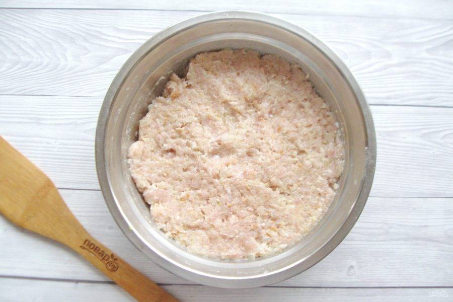Куриное филе помойте, лук очистите, помойте. Белый батон или булку залейте холодной, кипяченой водой и через несколько минут воду отожмите. Пропустите эти ингредиенты через мясорубку.