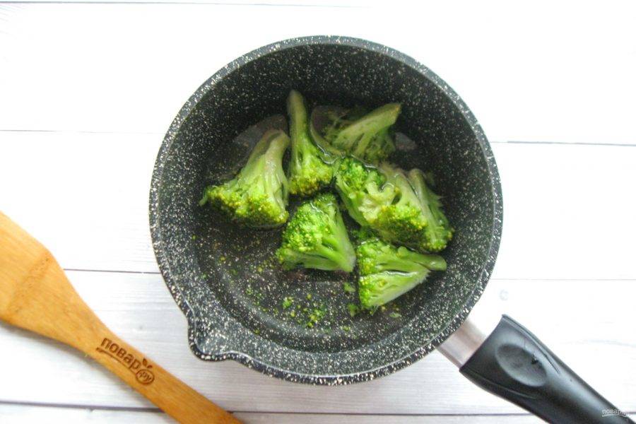 Брокколи разберите на соцветия и отварите в подсоленной воде в течение 5-6 минут. После воду слейте.
