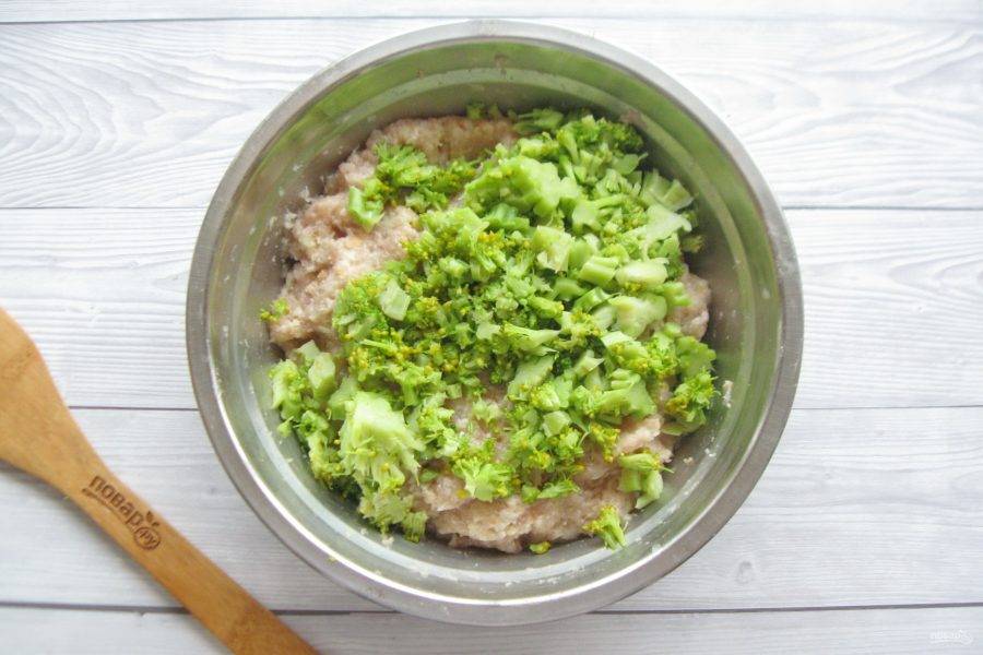 Брокколи охладите, мелко нарежьте и добавьте в фарш.