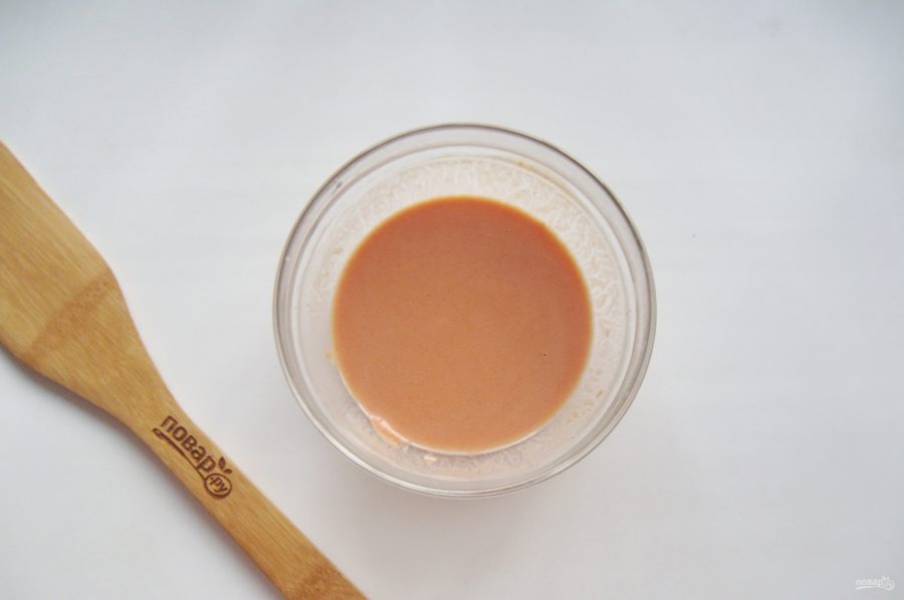 Перемешайте сметану, томатную пасту и муку, чтобы не было комочков. Налейте 250-300 мл. воды. Добавьте соль и сахар по вкусу.