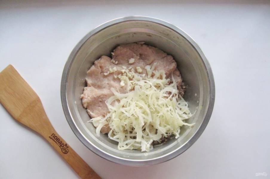 Капусту нарежьте и отварите до готовности в течение 10 минут. После добавьте в фарш.