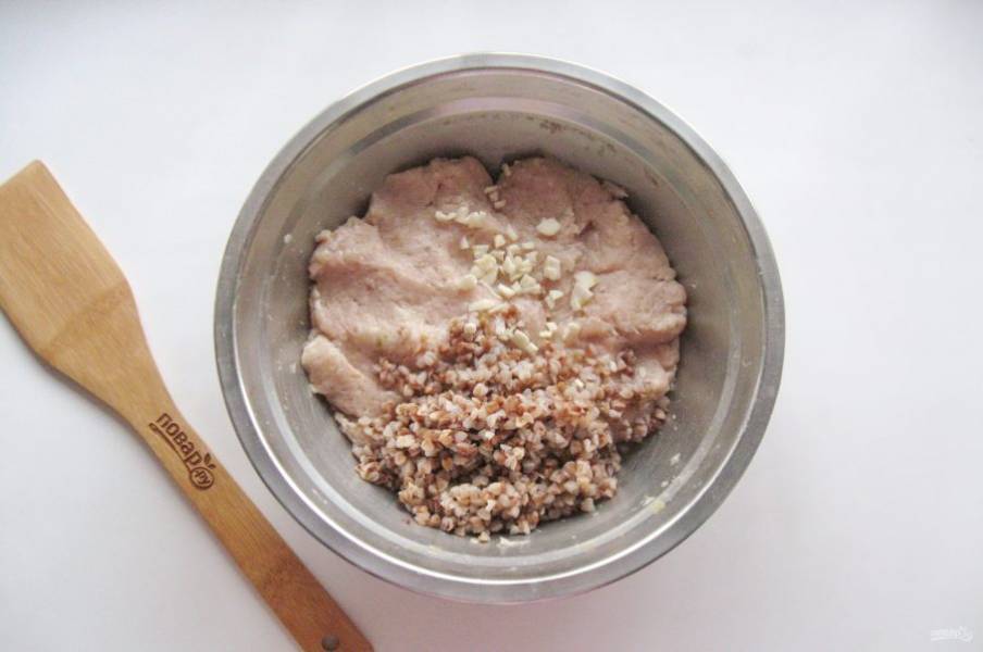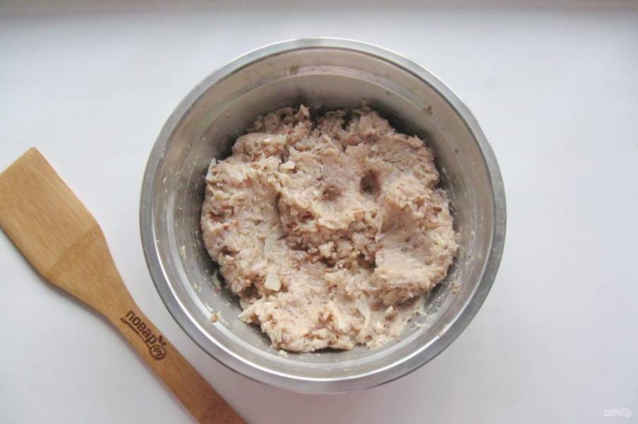 Репчатый лук очистите и помойте. Белый батон или булку залейте холодной водой и после отожмите. Пропустите через мясорубку оба эти ингредиента. Добавьте к мясному фаршу и тщательно перемешайте. После выложите в миску гречневую кашу.