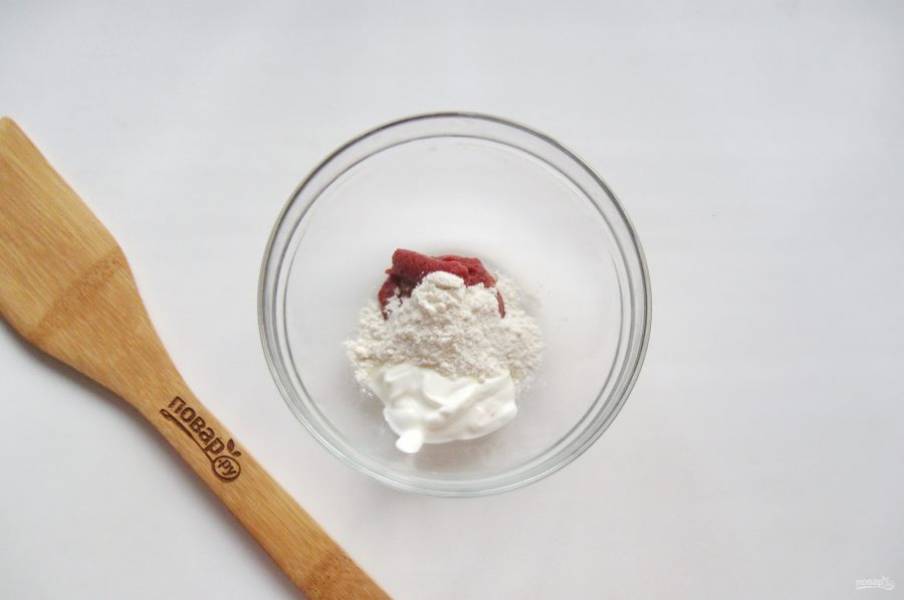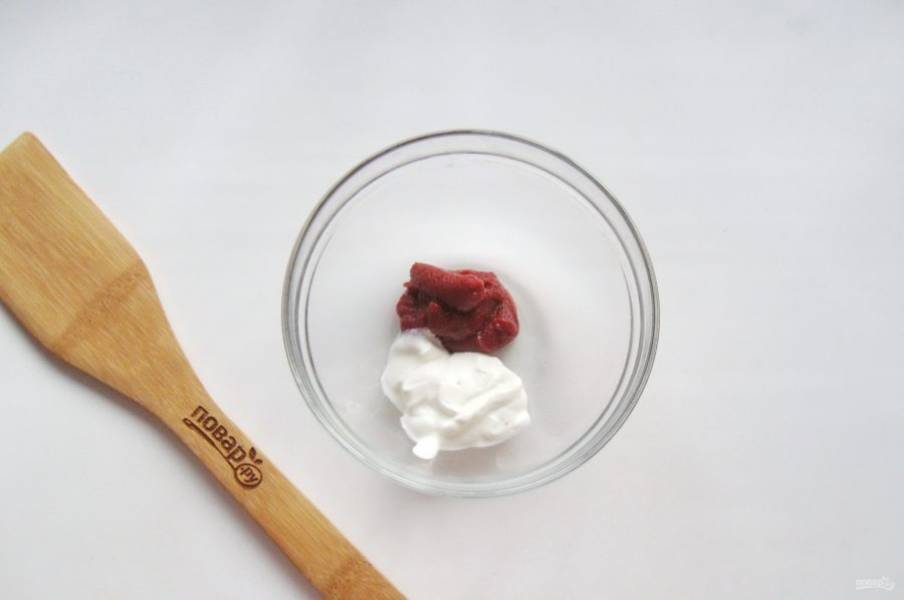 Приготовьте соус. В мисочку выложите томатную пасту и сметану.