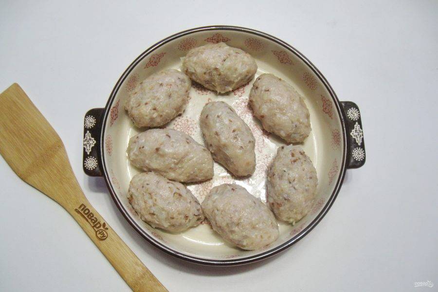 Сформируйте из фарша продолговатые котлеты и выложите в форму для запекания. Налейте немного бульона или воды и отправьте в разогретую до 180 градусов духовку на 15-20 минут.