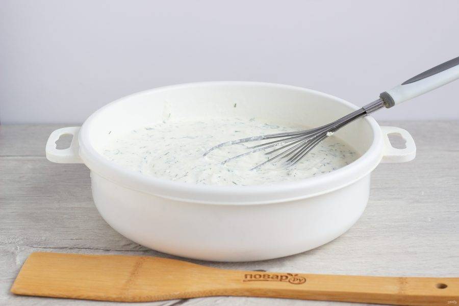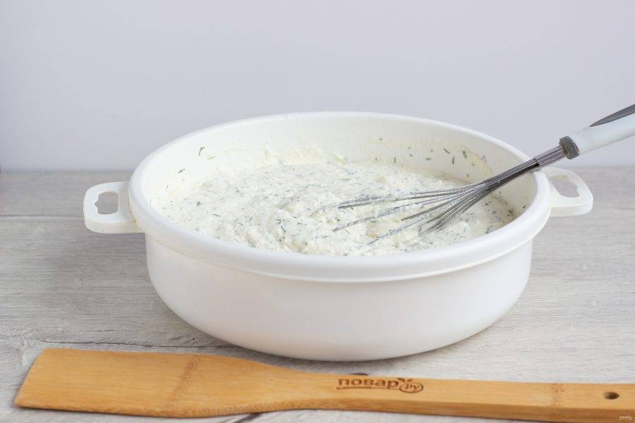 Затем добавляем творог, рубленную зелень и 0,5 ч. л. соли.