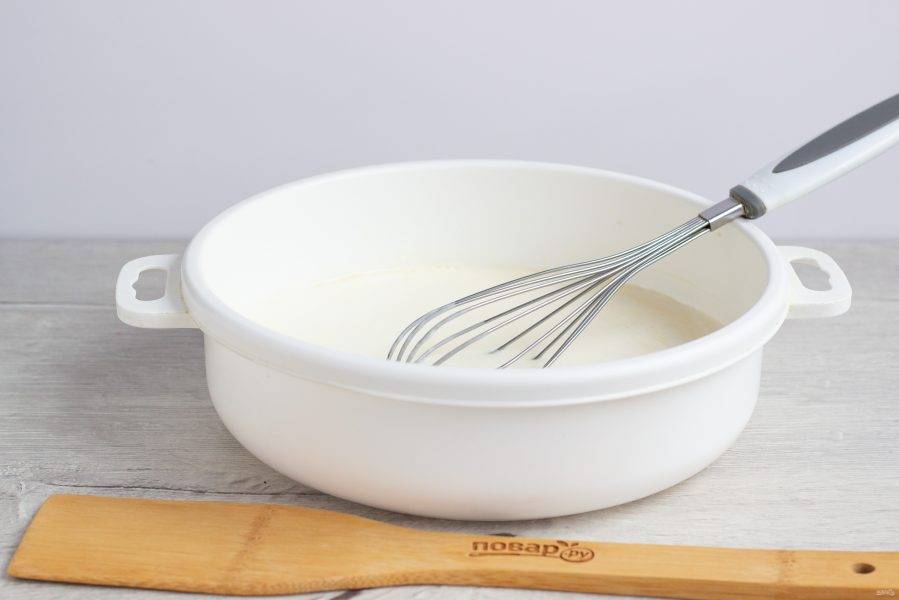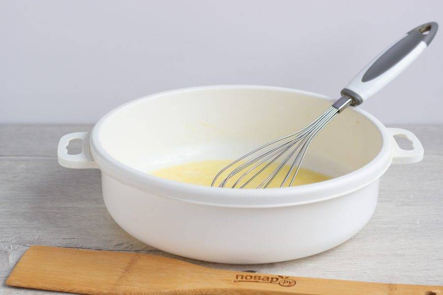 Соду соедините с кефиром, перемешайте и влейте в яйца.