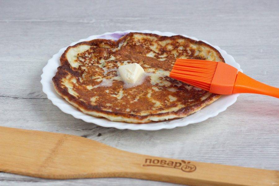 Сковороду смажьте растительным маслом, налейте половник теста и разровняйте. Выбирайте удобный для вас объем теста и толщину хачапури. Жарьте под крышкой на медленном огне с двух сторон до готовности. Готовый хачапури смажьте сверху небольшим количеством сливочного масла.