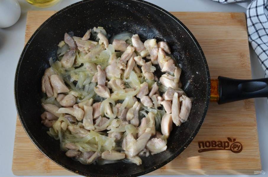 Очистите лук и чеснок, порежьте как нравится, кубиками или полукольцами. Мясо вымойте и порежьте небольшими кусочками. Разогрейте масло в сковороде и обжаривайте мясо с луком 5-7 минут до полуготовности.
