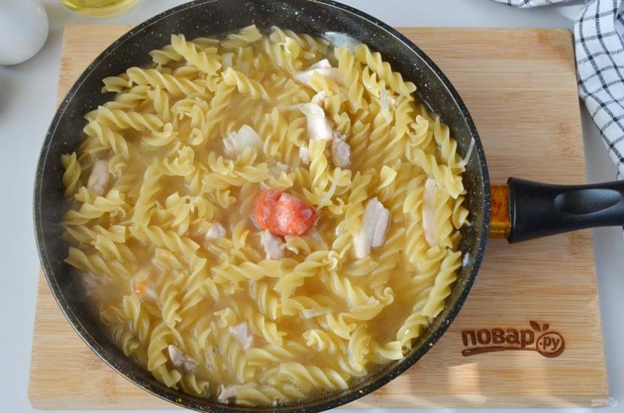 Добавьте макароны к мясу, соль, перец. По желанию любимые специи.