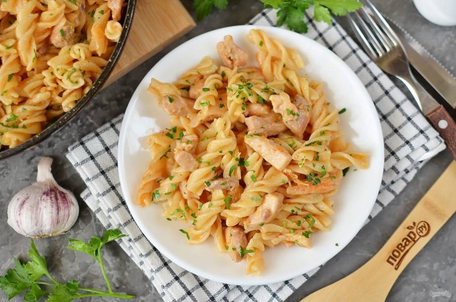 Притрусите макароны рубленой зеленью и подавайте к столу.