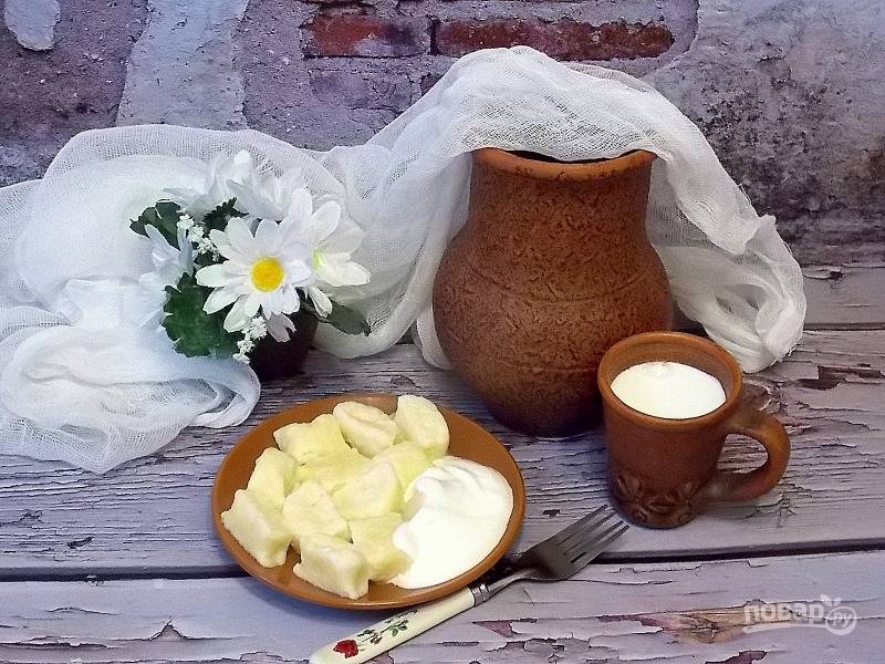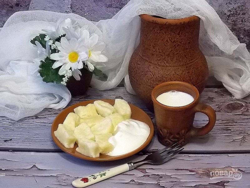 Выньте вареники и сразу подавайте со сметаной или молоком.