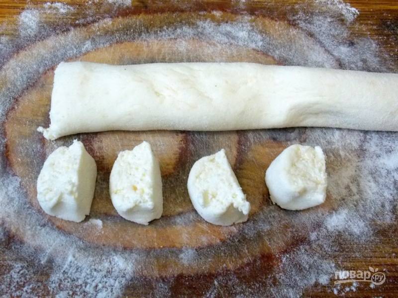 Скатайте колбаску и порежьте ее на маленькие кусочки.