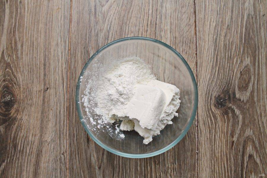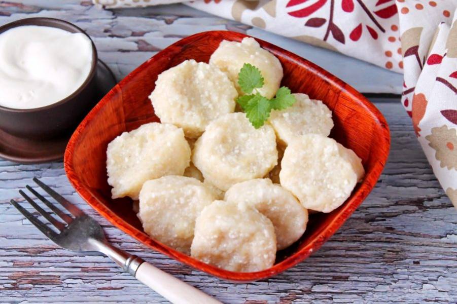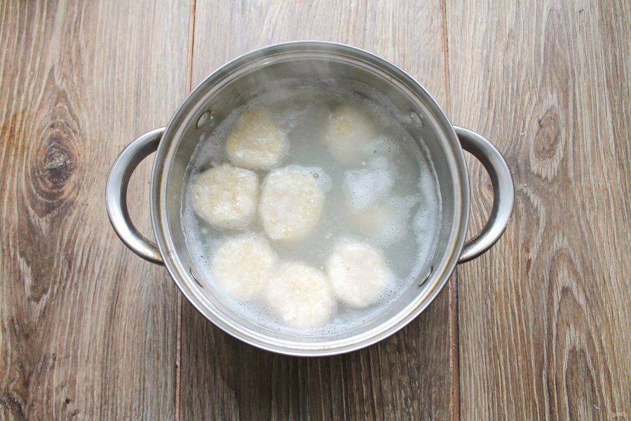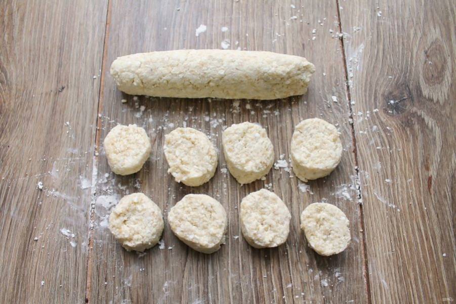Посыпьте стол немного крахмалом, переложите творожную массу и сформируйте колбаску. Опуская нож в крахмал, порежьте колбаску на кусочки, придайте круглую форму.