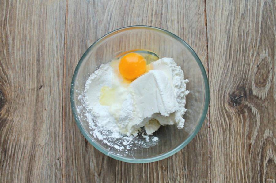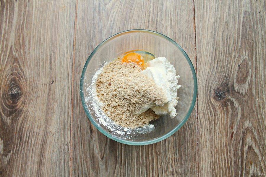 Отруби измельчите и выложите в миску с творогом, крахмалом и яйцом. Все хорошенько перемешайте до однородности и дайте постоять 5 минут.