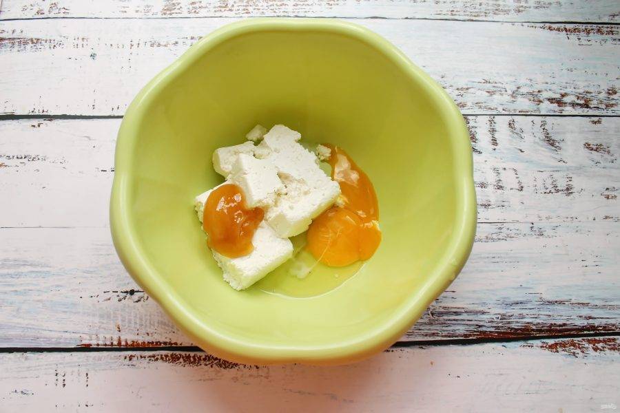 В миску выложите творог, мед и разбейте яйцо. Все немного посолите и перемешайте до однородности.
