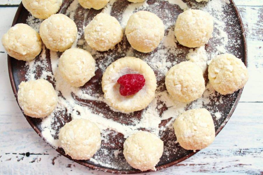 Каждый шарик намного приплюсните и выложите в центр по одной ягодке.