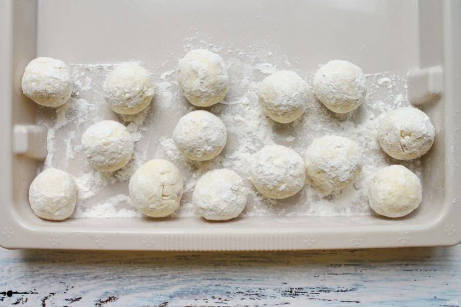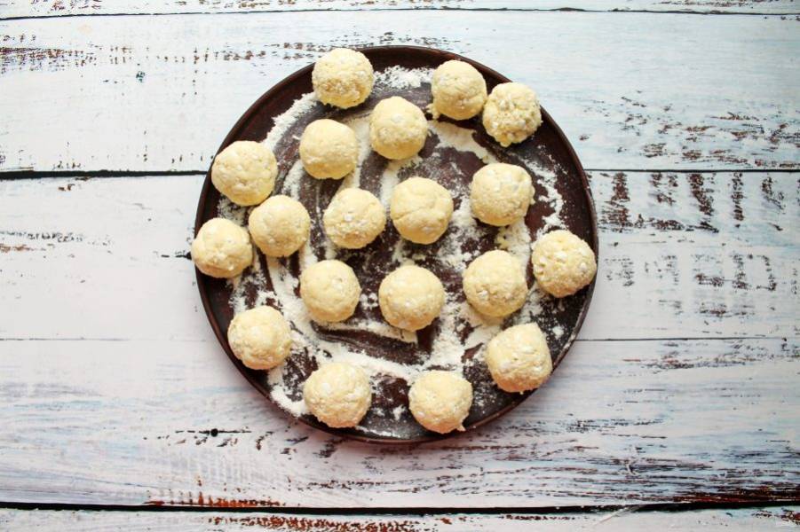 Посыпая руки мукой, разделите тесто на кусочки с грецкий орех и скатайте шарики.