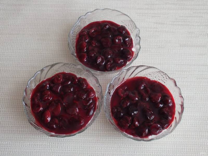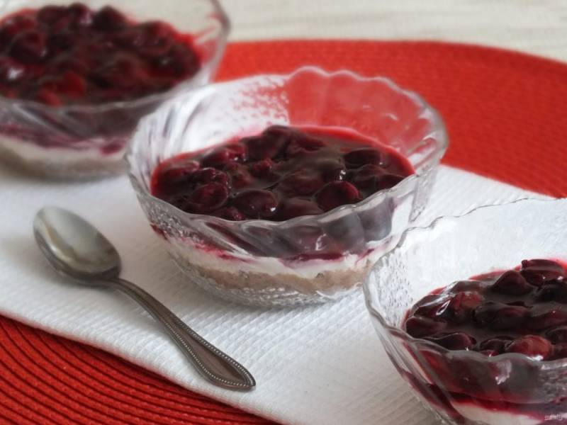 Сверху разлейте вишневый соус. До подачи держите десерт в холодильнике.