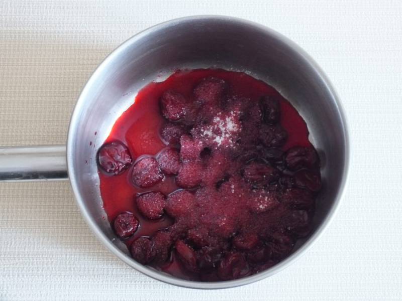 В сотейник выложите вишню вместе с соком, добавьте сахар. Поставьте на средний огонь.