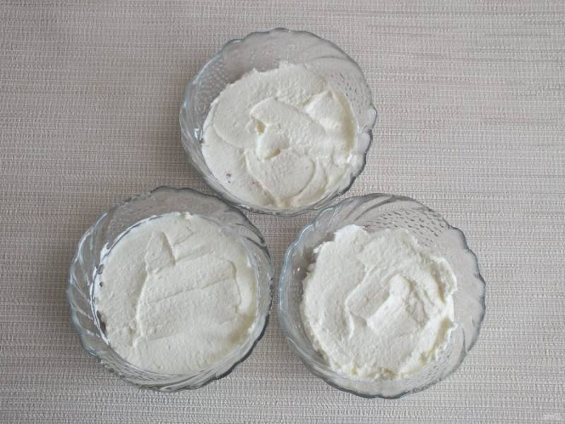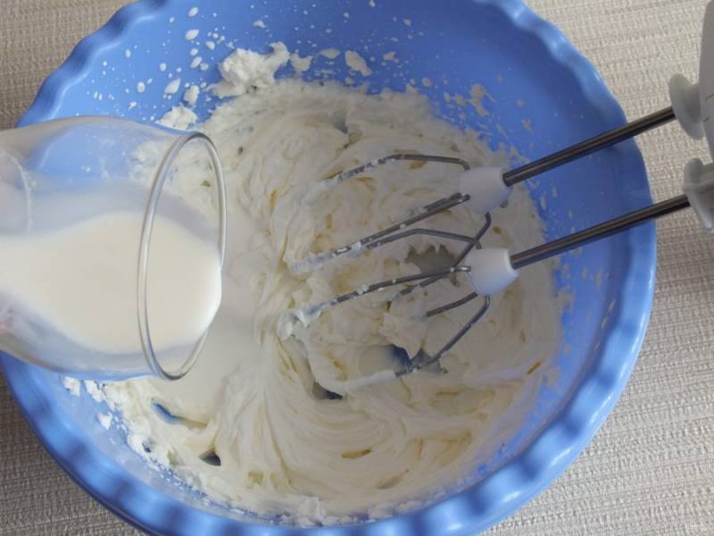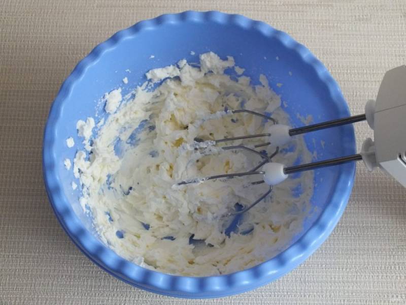 Добавьте охлажденные сливки. Взбейте в густую массу.
