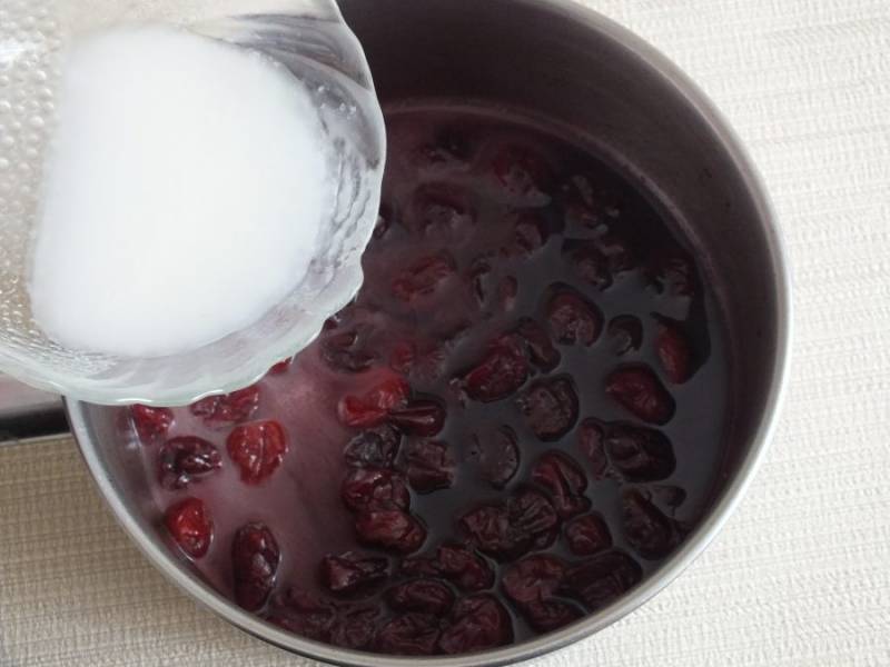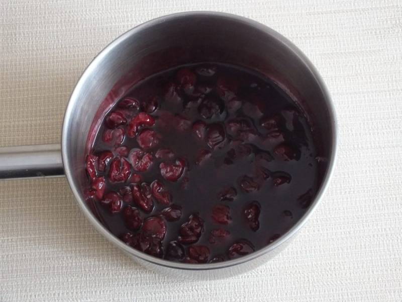 Доведите вишню до кипения. Добавьте разведенный крахмал и помешивая, уварите до загустения.