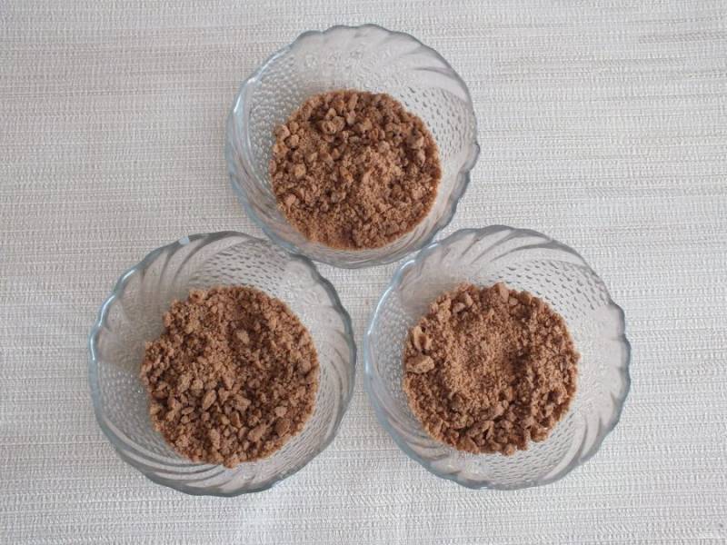 Возьмите глубокие чашки или бокалы, разложите измельченное печенье.