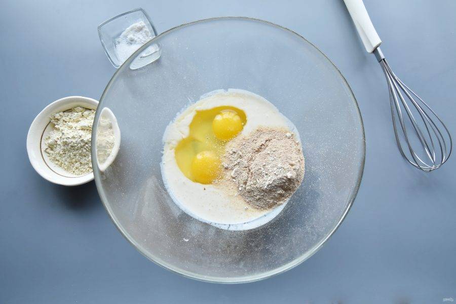 Соедините в миске яйца, кефир. Всыпьте овсяные отруби и глютен. Перемешайте до однородного состояния. Тесто получается довольно жидким. Всыпьте соль и соду (разрыхлитель), перемешайте.