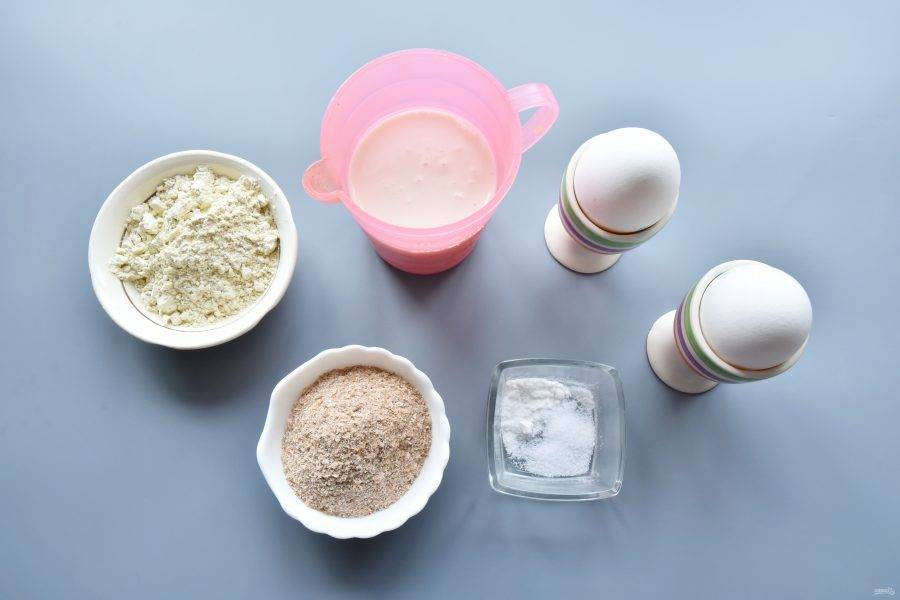 Для приготовления хлебной лепешки приготовьте продукты. Кефир используйте обезжиренный. Его можно заменить йогуртом или простоквашей.