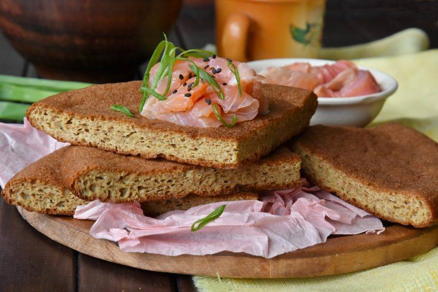 Такую лепешку можно дополнить льняным семенем или прованскими травами. Разрежьте ее на 4 части и используйте для приготовления бутербродов.