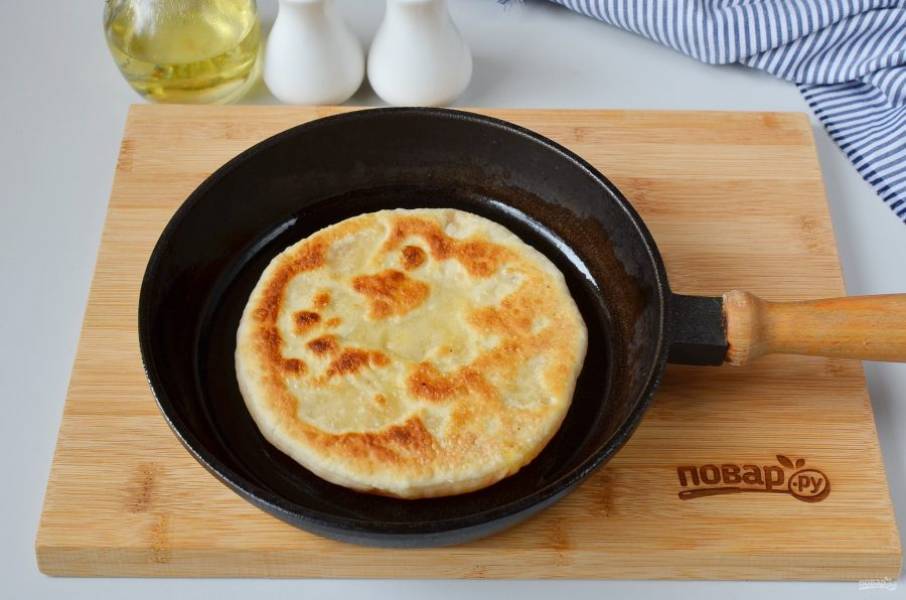 Разогрейте хорошо сковороду. Смажьте 1/2 ч.л. масла растительного и жарьте лепешку до золотистого цвета, переверните и обжарьте другую сторону.