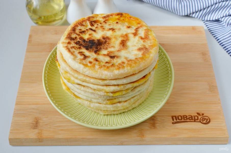 Пережарьте все лепешки. Сложите стопочкой, можно дополнительно перемазать их сливочным маслом, если хотите. Подавайте горячими!