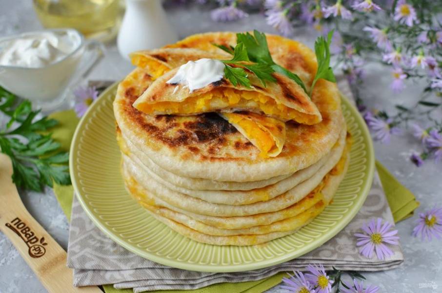 Хочу поделиться простым рецептом приготовления очень вкусных лепёшек с тыквой. Они получаются замечательными, внутри сочная начинка из тыквы и лука, а снаружи подпечённое тесто.