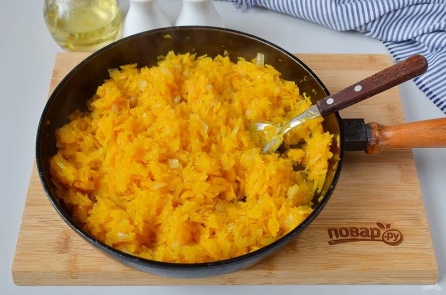 Добавьте тыкву к луку, жарьте до 5 минут. Тыкву не надо обжаривать до готовности, необходимо дождаться момента, когда она начнет пускать сок, и сразу же выключить огонь.