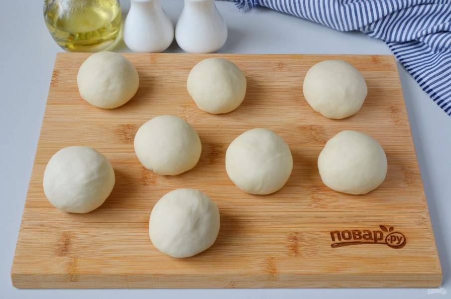 Разделите тесто на 8 частей, каждую скатайте в шарик. Накройте пленкой или полотенцем, чтобы тесто не сохло.