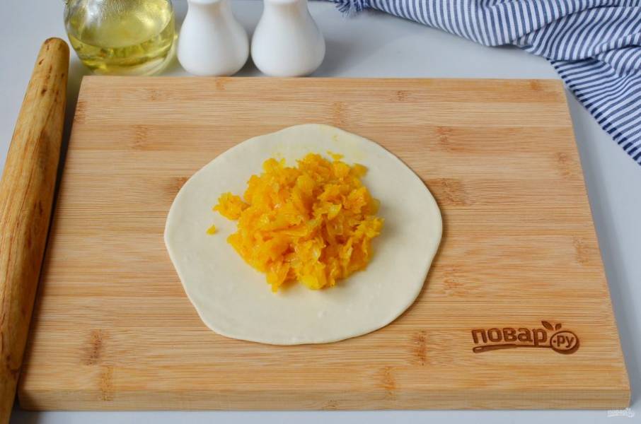 Далее очень аккуратно растягивайте узелок в лепёшку, стараясь не повредить целостность теста. Диаметр каждой получившейся лепёшки с тыквой, примерно, 15-16 см.