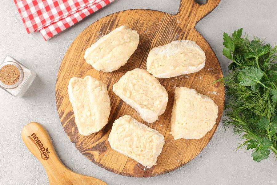 Разделите тесто на равные части, количество зависит от желаемого размера готовых лепёшек.