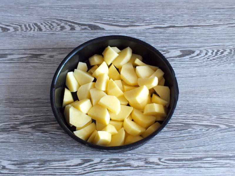 Возьмите продолговатую форму для запекания. Важно, чтобы в неё полностью уместился лещ и она не была сильно глубокая. Очень хорошо подходит для этой цели крышка от утятницы. Выложите картофель. В середине формы его слой должен быть тоньше, чем по бокам.