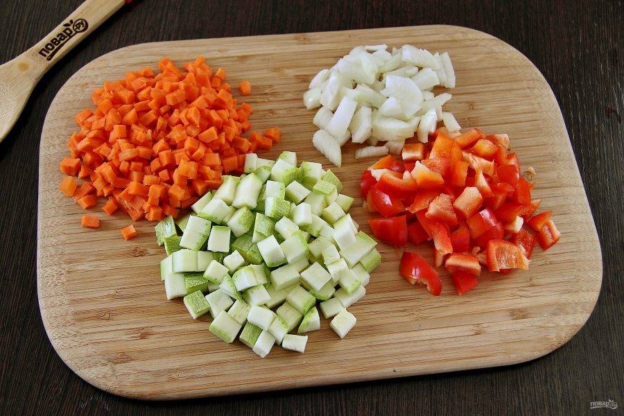Лук, морковь, перец и кабачок нарежьте небольшими кубиками.
