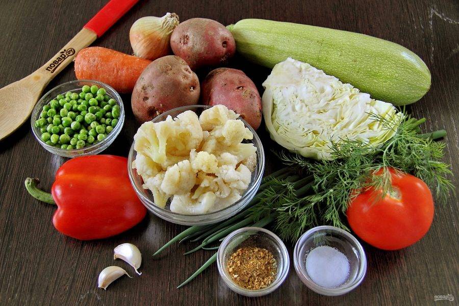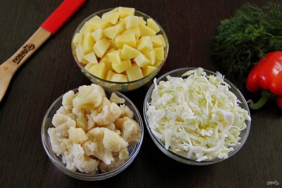 Тем временем нарежьте кубиками картофель, цветную капусту разберите если необходимо на соцветия, белокочанную мелко нарежьте. Как только вода закипит, добавьте овощи в кастрюлю и варите до готовности.