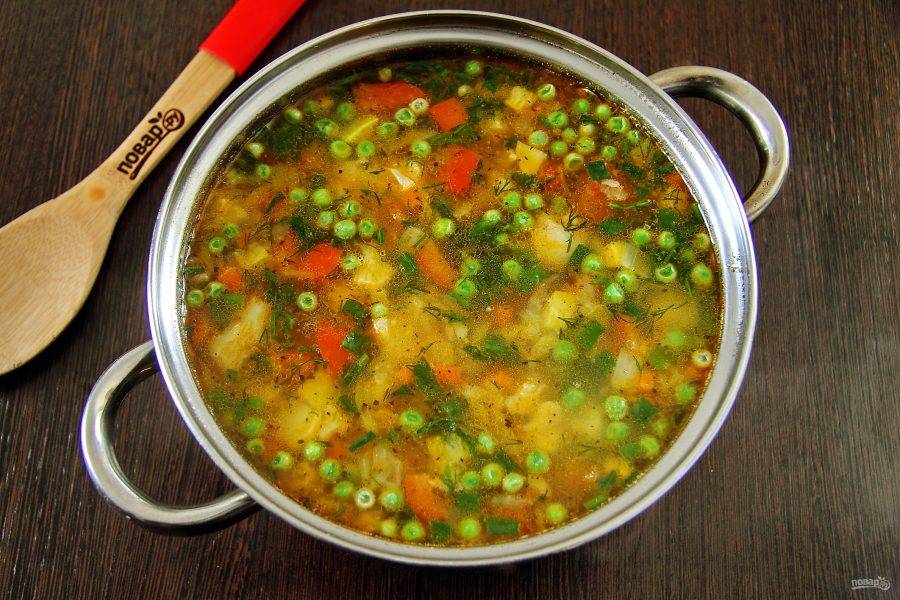 Отправьте содержимое сковороды в кастрюлю. Добавьте по вкусу соль и любимые специи. Варите суп до полной готовности всех овощей.