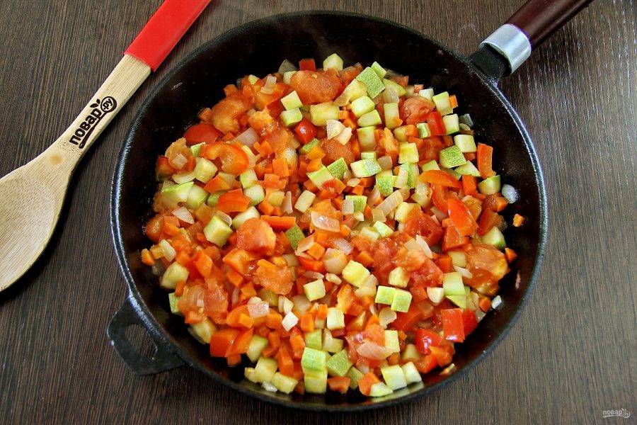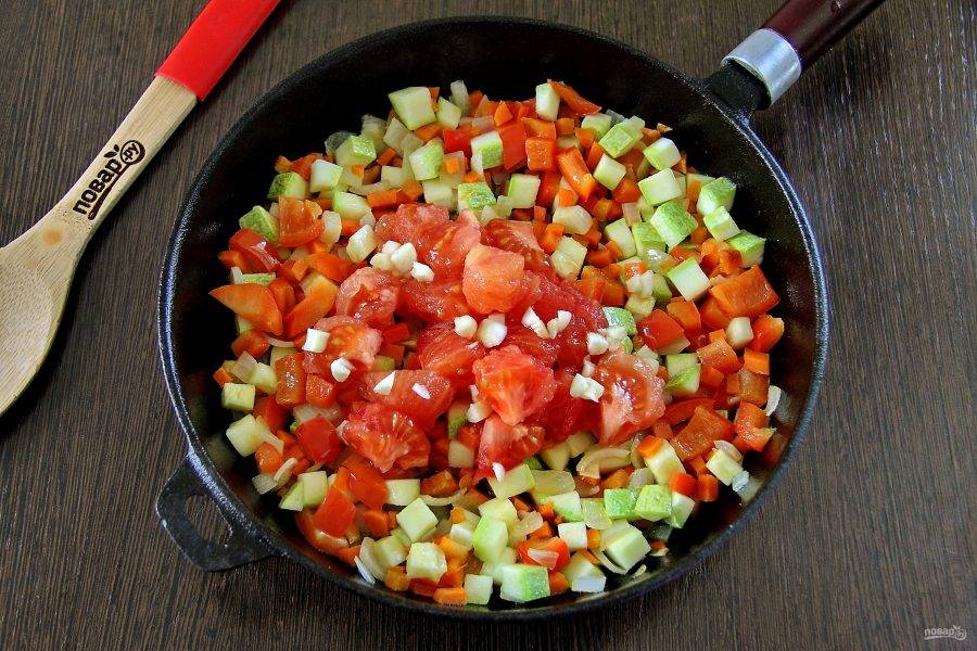 Помидор обдайте кипятком, снимите шкурку и нарежьте кубиками. Добавьте мякоть к обжаренным овощам. Добавьте измельченный ножом чеснок и обжарьте все вместе еще пару минут.