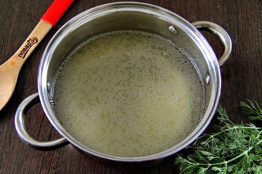Налейте в кастрюлю воду. У меня сегодня легкий куриный бульон. Поставьте кастрюлю на огонь.