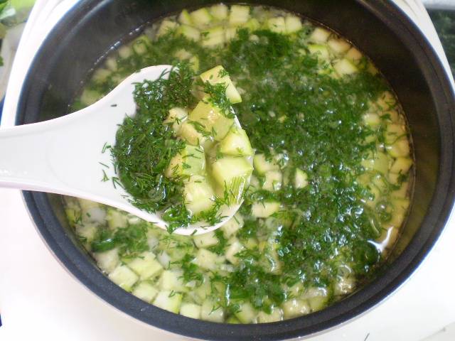 8. Заправляем суп зеленью. Провариваем одну минуту и выключаем. Летний суп готов. Приятного!